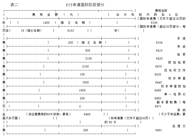 国家财政部批准收取的以及为世界知识产权组织国际局代收的专利费用会计科目的代码。